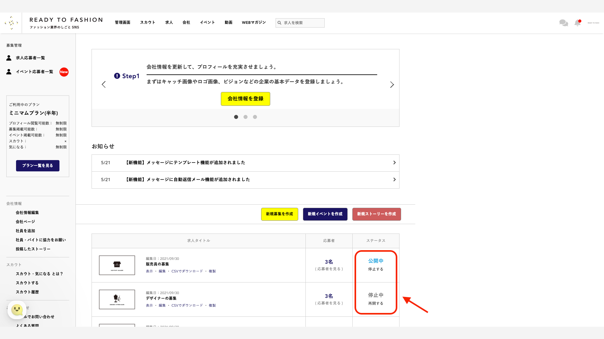 求人を停止または再開したい場合は求人一覧から「停止する/再開する」をクリックしてください。