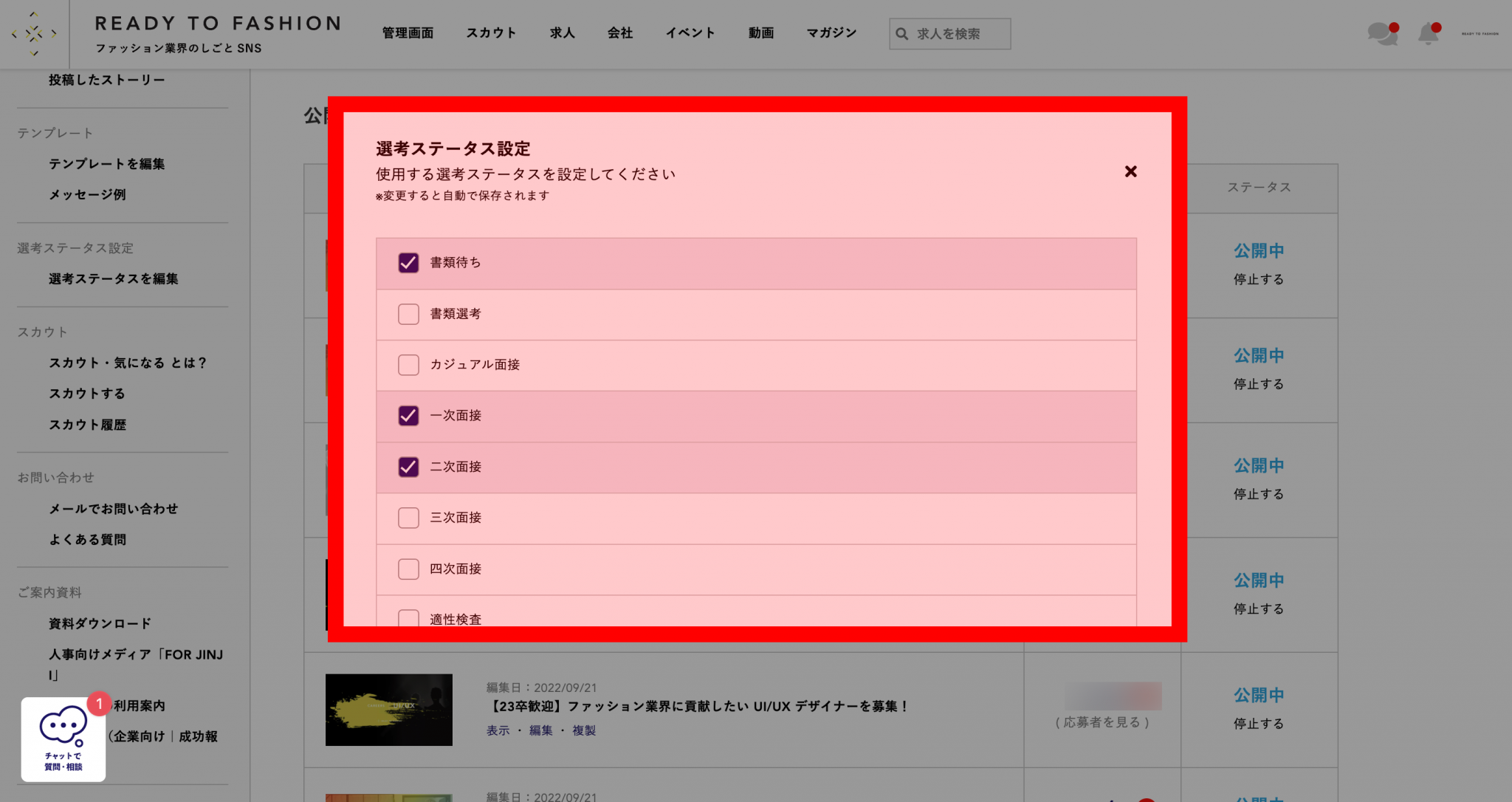 READY TO FASHIONの管理画面ページでは、応募者の採用状況(選考ステータス)を設定・管理することが可能です。