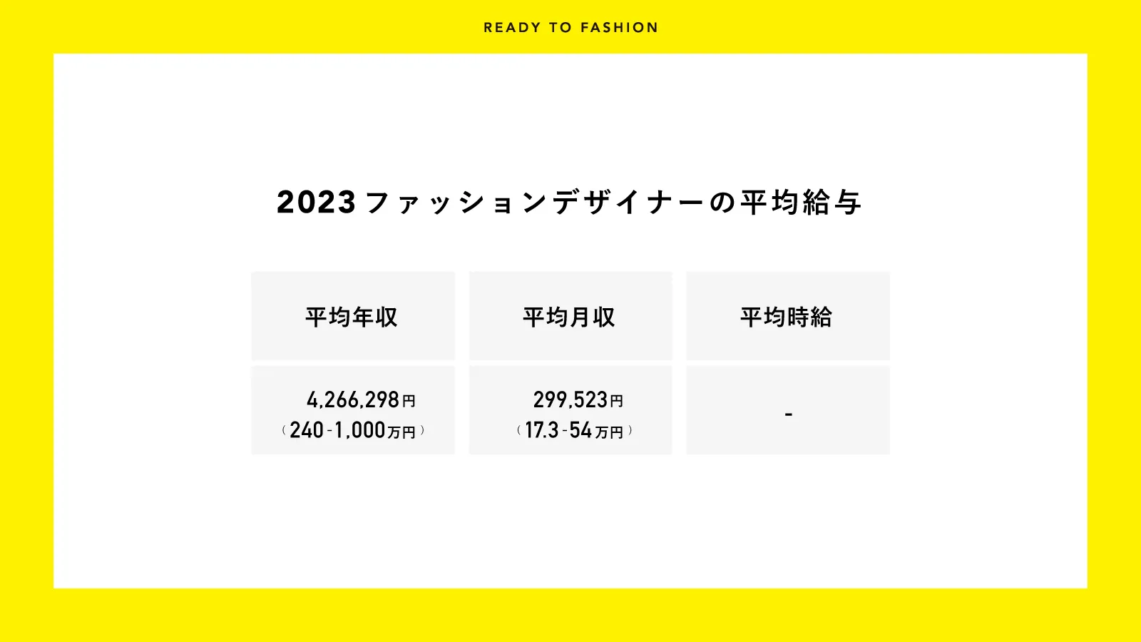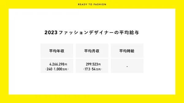 この記事では、弊社が運営するファッション・アパレル業界特化型の求人プラットフォーム「READY TO FASHION」に掲載された171件超の求人情報(2023年4月5日時点)から得られた情報をもとに、ファッションデザイナーの平均年収、月収を算出しご紹介。