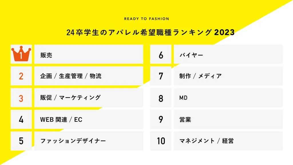 「パタンナー」は11位でしたが、5位には専門職ながら「ファッションデザイナー」がランクイン。6位以降は、「バイヤー」や「MD」、「マネジメント / 経営」などで、業界での経験値が問われる職種はランキングの中でも下位に位置する結果となりました。