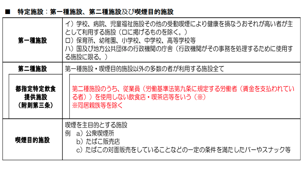 2020年4月1日、健康増進法の一部を改正する法律が全面施行となりました。法律の対象となる施設は第一種施設・第二種施設・喫煙目的施設に分類されています。