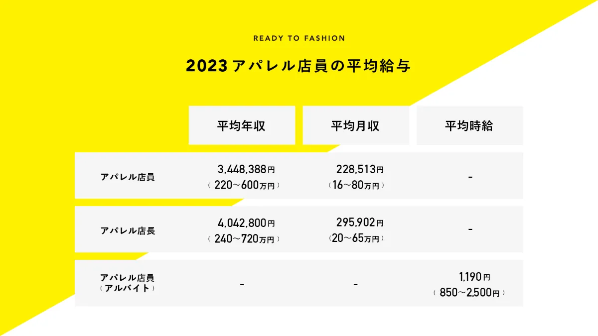 この記事では、弊社が運営するREADY TO FASHIONに掲載されている1200件超の求人情報(2023年3月15日時点)から得られた情報をもとに、アパレル店員とアパレル店長の平均年収、月収、時給を算出しご紹介。